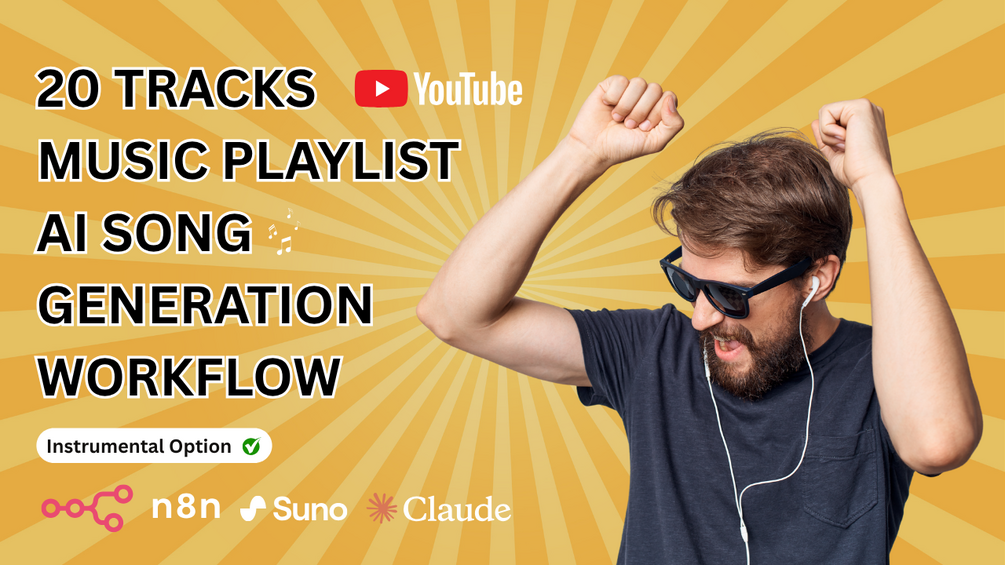 This professional-grade N8N workflow system automatically creates 20 unique songs per playlist (40 total tracks with 2 versions each) using cutting-edge AI technology. Simply describe your desired playlist through Telegram, and watch as the system generates song ideas, writes lyrics, produces audio, and organizes everything in Google Drive.